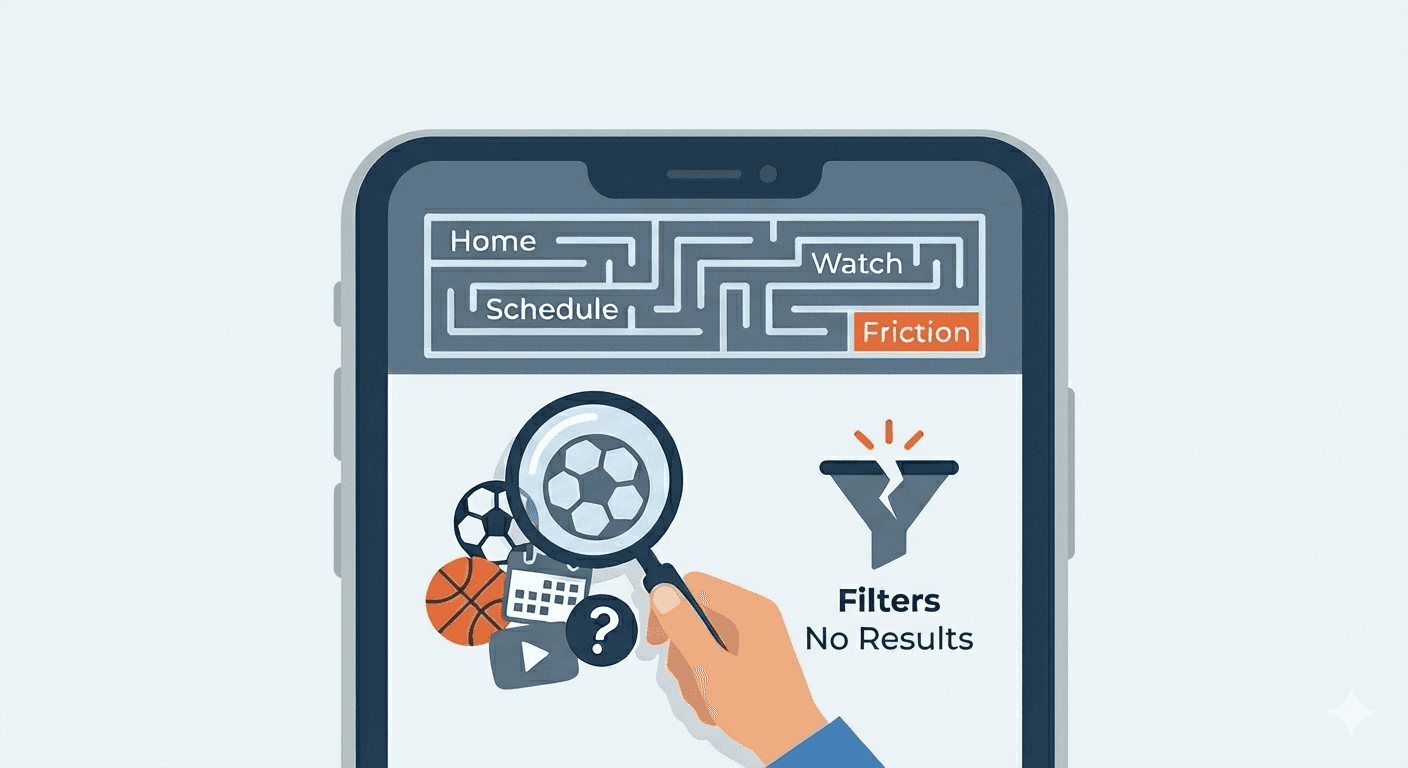 Following a favorite team or sport becomes a chore when navigation is cluttered and lacks intuitive filtering. Users are forced to scroll excessively just to find basic match information, while critical actions like purchasing tickets or finding the "favorites" screen are inconsistently placed.